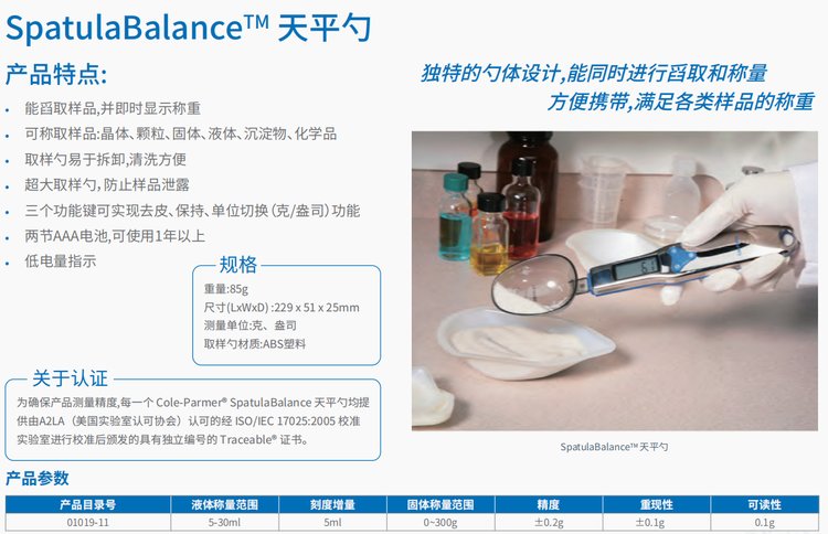 特别的勺体设计,能同时进行舀取和称量方便携带,满足各类样品的称重
