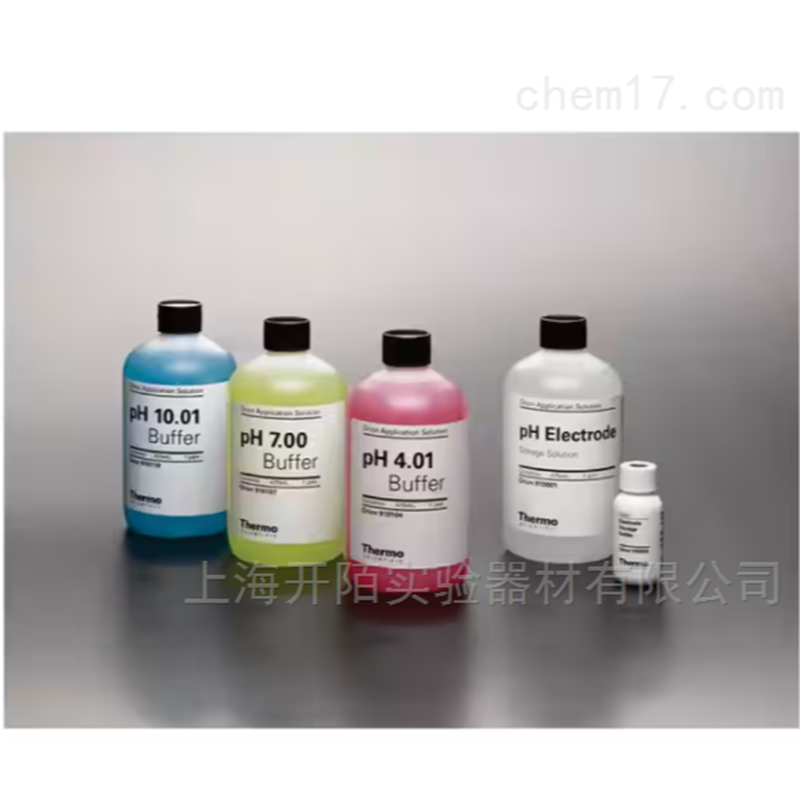 包含:各一瓶 1 品脱 (475 mL) 的 pH 4.00 缓冲液 (910104)、pH 7.00 缓冲液 (910107)、pH 10.01 缓冲液 (910110) 和标准 pH 电极储存液 (910001),以及一个 pH 电极储液瓶。